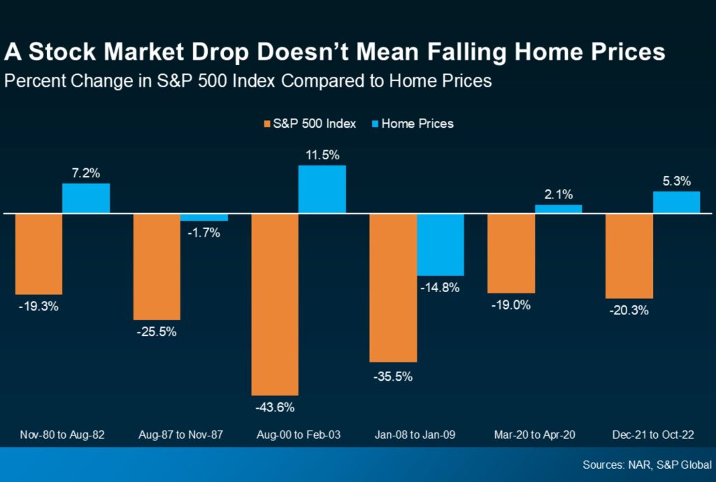 Take a look at the graph below. It shows what happened to home prices (the blue bars) during past stock market swings (the orange bars):